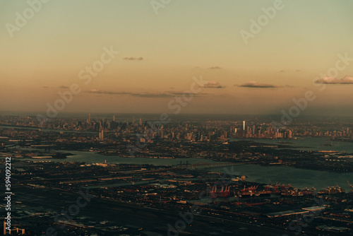 Obraz premium view of new york and new jersey from the plane on sunset