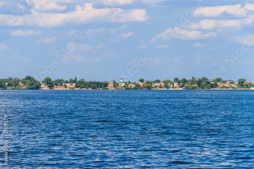 Naklejka premium View of Nikopol town from Kakhovka reservoir, Ukraine