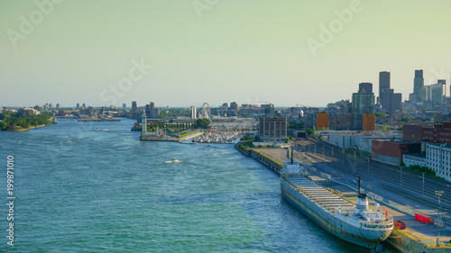 Fototapeta premium View of old port area with large ship, middel of the summer, Montreal, Canada