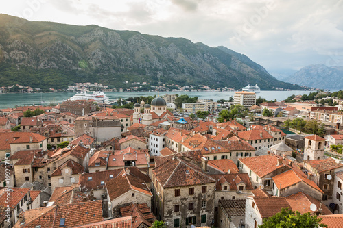 Fototapeta premium View of old town roofs in a Bay of Kotor from Lovcen mountain in Montenegro.