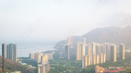 © Amateur007, Naklejka premium View of one of the districts of Sanya city. Visible are the skyscrapers. Sunset, blur, haze. Hainan Island, China.