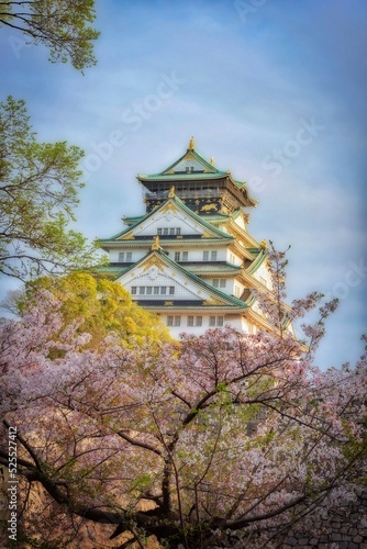 © Mr, Fototapeta premium View of Osaka Castle with cherry blossom trees as a frame and dramatic sky.