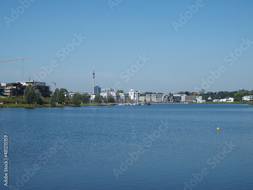 Naklejka premium View of Phoenix Lake in the Dortmund suburb of Hoerde, North Rhine-Westphalia, Germany, a renatured industrial wasteland, in the background left the Dortmund TV tower