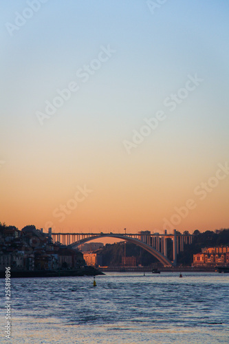 Naklejka premium view of ponte da arrabida from gaia in porto, portugal at sunset with blue...