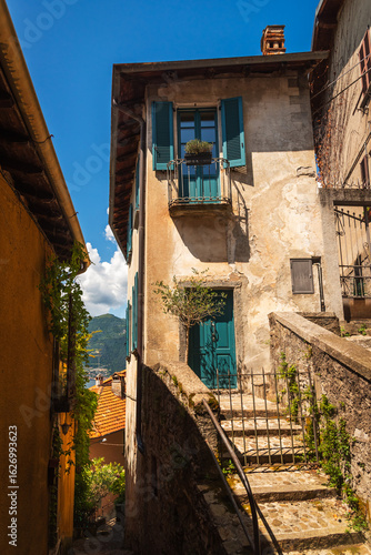 Fototapeta premium View of Ponte del lago, Nesso on Lake Como in Italy. Buildings, lake and mountains on a sunny summer day