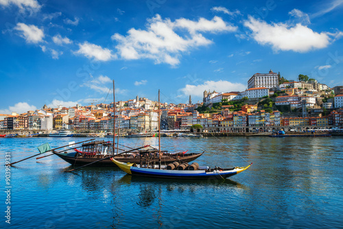 © Dmitry Rukhlenko, Fototapeta premium View of Porto city and Douro river with traditional boats with port wine barrels from famous tourist viewpoint Marginal de Gaia riverfront. Porto, Vila Nova de Gaia, Portugal