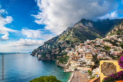 © Julia Chan, Naklejka premium View of Positano beach and houses on the hills