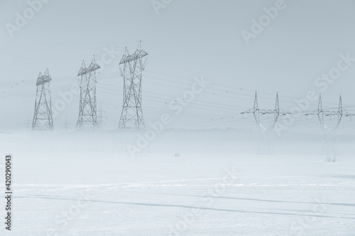Fototapeta premium View of power line towers in fields with base shrouded in fog during a...