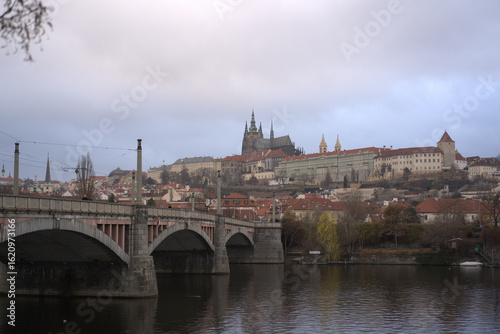© Dana, Fototapeta premium View of Prague Castle from the Vltava River with a cloudy sky and bridges in the foreground during late afternoon