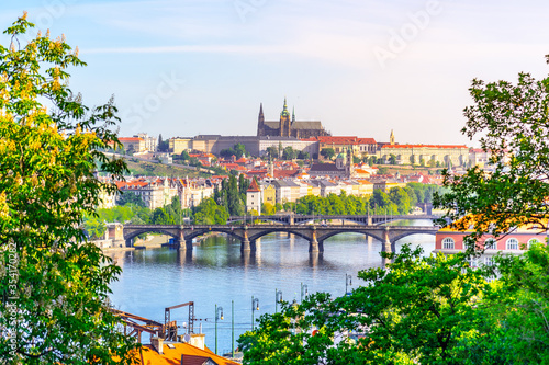 © pyty, Naklejka premium View of Prague Castle from Vysehrad with lush green spring trees, Prague, Czech Republic