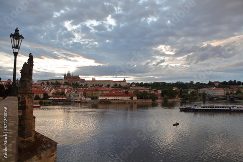 © Jacqueline Akcasu, Fototapeta premium view of prague in czech republic from charles river with reflection on river and clouds.