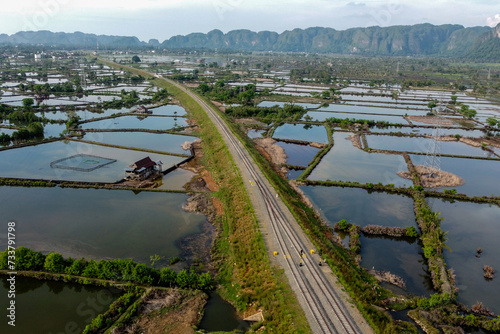 Fototapeta premium View of railway tracks and rice fields in the countryside in, Indonesia