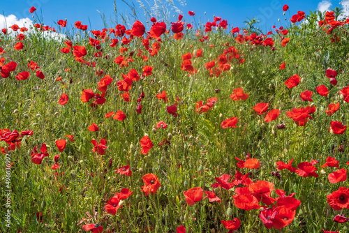 Fototapeta premium View of red flowering corn poppies against a blue sky on a sunny spring day