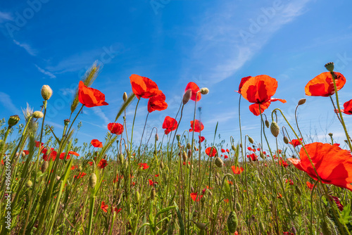 Obraz premium View of red flowering corn poppies against a blue sky on a sunny spring day
