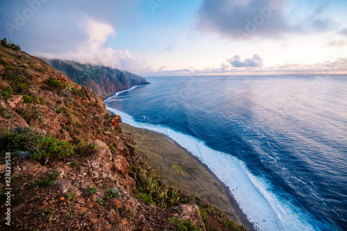 © Zedspider, Fototapeta premium View of rough ocean with waves, volcanic beach, sunset over a huge cliff in Lighthouse Ponta do Pargo, Madeira, Portugal