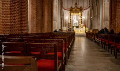 Naklejka premium View Of Rows Of Chairs In Catholic Cathedral