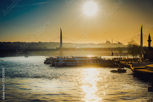 © bruno135_406, Naklejka premium View of ship at harbor with bridge in the background