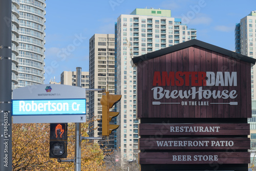 © eugen, Fototapeta premium view of sign near Amsterdam Brewhouse, a brewpub, located at 245 Queens Quay W, Toronto (at Robertson Cr)