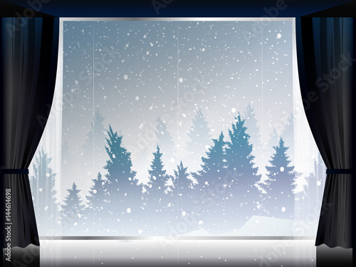 © moga52, Fototapeta premium view of snowstorm and pine wood in room with large window