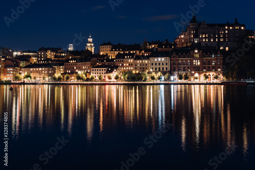 Obraz premium View of Sodermalm with illuminated historical buildings during the night in Stockholm, Sweden.