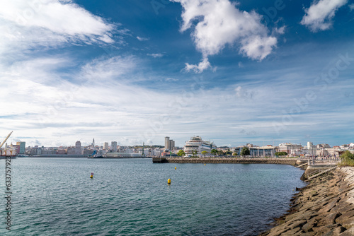 © alexemarcel, Fototapeta premium View of spectacular Marina Real Port. Beautiful cruise ship docked in the bay. Yachts and fishing boats. Travel destination in Galicia, North of Spain