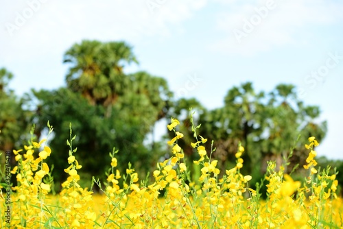 © tharathip, Obraz premium View of sugar palm and yellow fields.