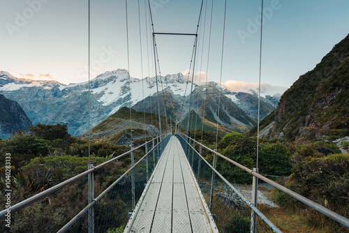 Obraz premium View of suspension bridge with mountain range on Hooker Valley Track in national park at New Zealand