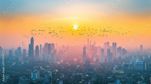 © Suradiman, Fototapeta premium view of tall buildings decorated with flying birds and trees