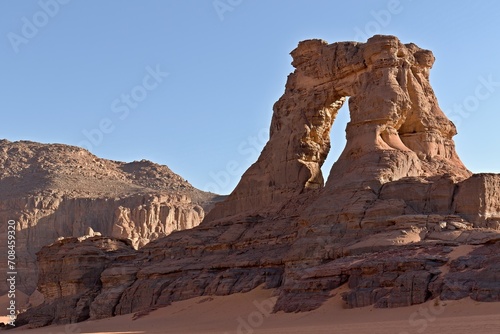 Fototapeta premium View of Tamezguida arch, rock formation in Tadrart Rouge rocky mountain range in Tassili n Ajjer National Park. Sahara desert, Algeria, Africa.