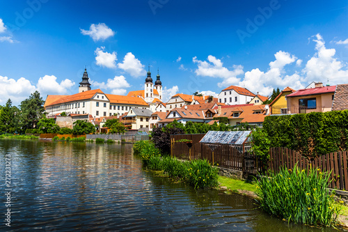 Fototapeta premium View of Telc across pond with reflections, Unesco world heritage site, South...