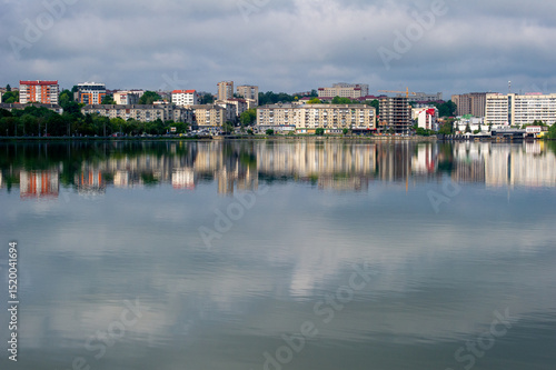 © Andrey, Obraz premium view of Ternopil cite reflected in the lake, Ukraine