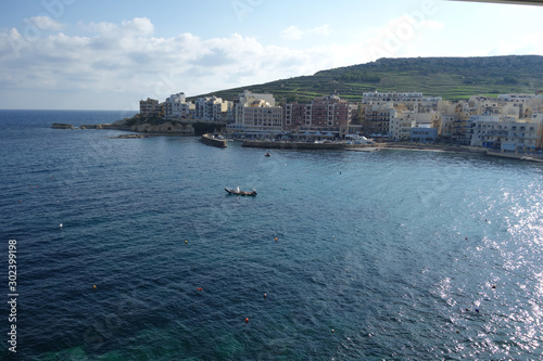 Naklejka premium View of the bay of Marsalforn, a town on the north coast of Gozo, Malta, the...