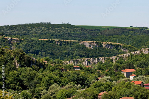 © vili45, Fototapeta premium View of the beautiful village of Nisovo, Bulgaria, located below, above and in the high limestone cliffs, protected by magnificent deciduous trees