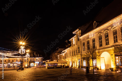 © Roberto Sorin, Fototapeta premium view of the Big Square from Sibiu city with Christmas lights