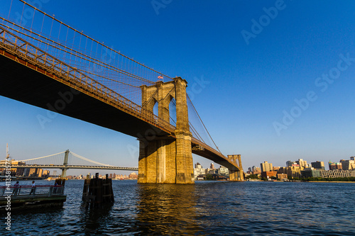 Naklejka premium View of the Brooklyn Bridge seen from the East River Greenway in Manhattan with people standing under the bridge on an observation deck