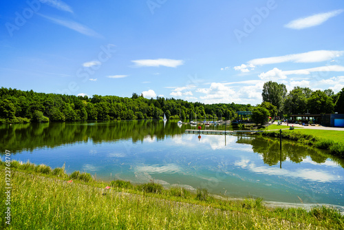 Fototapeta premium View of the Bucher Reservoir and the surrounding landscape. Nature near Rainau.