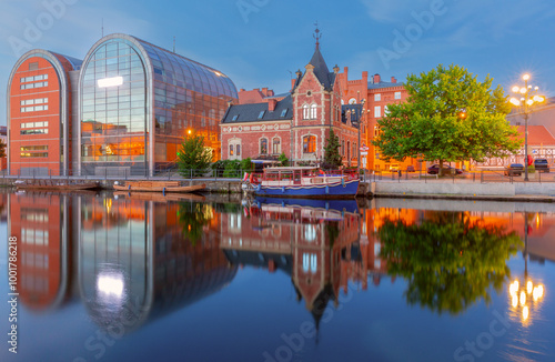 © Kavalenkava, Fototapeta premium View of the Bydgoszcz waterfront featuring a modern glass building and a historic red brick structure, with reflections in the Brda River in Poland