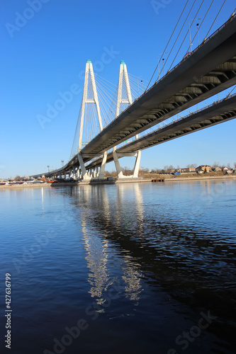 © Elena, Naklejka premium View of the cable-stayed bridge pylons and a fragment of the highway with reflexes in the water for a thematic banner