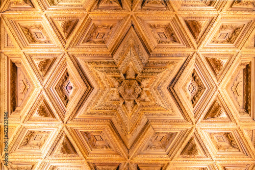 Obraz premium View of the ceiling of a chapel carved in wood with geometric shapes of the...