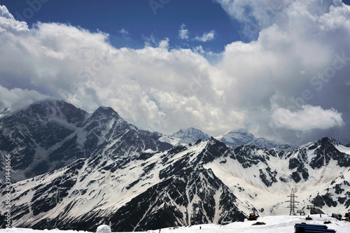 Fototapeta premium View of the Cheget and Nakra peaks from the Elbrus slope.