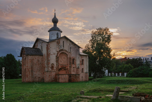 © Ula Ulachka, Naklejka premium View of the Church of St. Paraskevi (Paraskevy Pyatnitsy na Torgu) on the territory of Yaroslavovo Dvorishche against the background of the dawn sky, Veliky Novgorod, Russia
