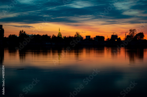 © Anatolii, Naklejka premium View of the city at sunset with water reflection
