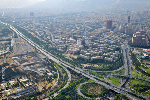 © Klara Bakalarova, Fototapeta premium View of the city, highway and surrounding houses from the Milad Tower (Borj-e Milad) in Tehran. Milad Tower is the most important monument of Tehran after the Azadi Monument.