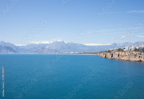 Fototapeta premium View of the city of Antalya. Sea, mountains, roads. City. Beautiful view. Turkey. Holidays in Antalya. Beautiful city
