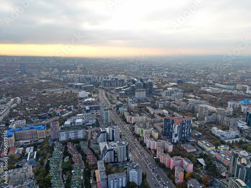 © Vladimir, Obraz premium View of the city, with different buildings and streets. Sunset time. Autumn. The view from the drone.