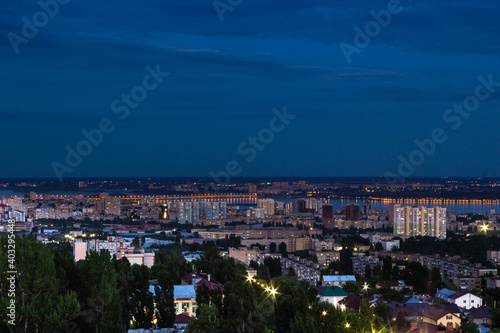 © Алекс Швачко, Fototapeta premium View of the city with high-rise buildings against the background of the river and sunset.