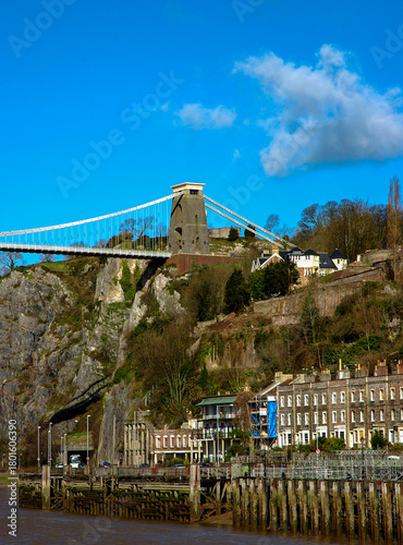 © Marcos, Fototapeta premium View of the Clifton Suspension Bridge in Bristol, England, with buildings and a river in the foreground.