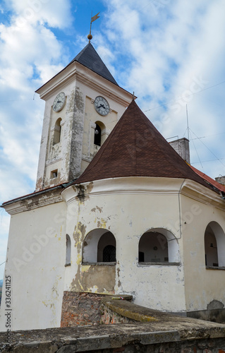 © Dmytro, Obraz premium View of the clock tower of old Mukachevo castle Palanok against cloudy sky. Popular with tourists and visitors. Transcarpathia, Ukraine