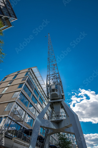 Obraz premium View of the construction crane in the Hamburg Hafencity. HafenCity quarter in...