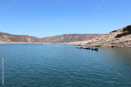© SilviaCZaninovich, Obraz premium View of the dam El Nihuil in San Rafael, Mendoza, Argentina. Man carrying canoes in the calm waters.